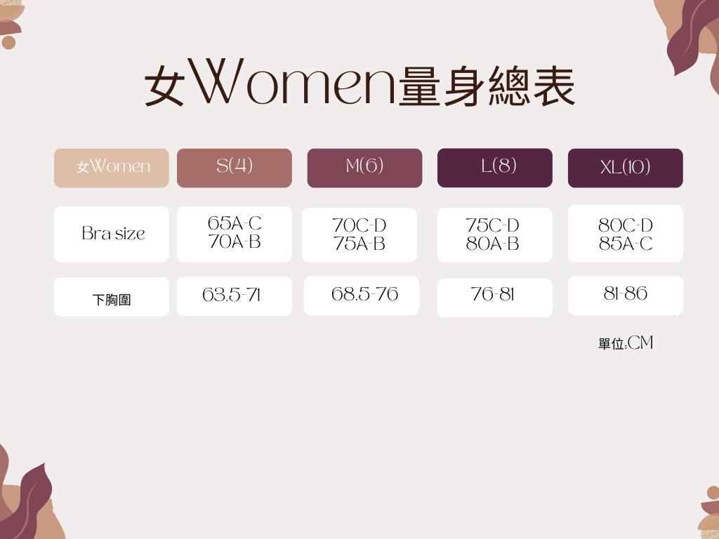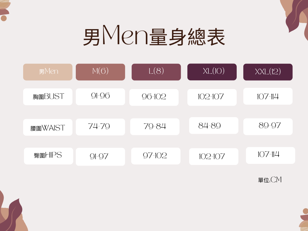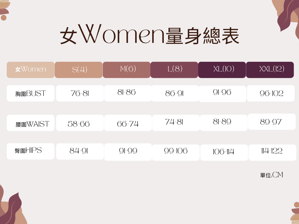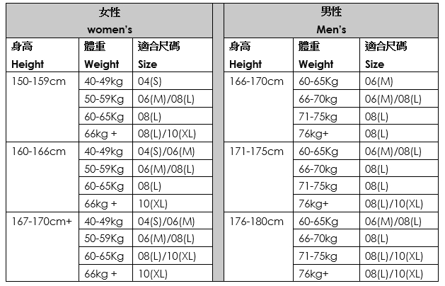 ◆ 此表僅提供標準尺碼的對照資訊,實際合身度則依據各款設計和身型有所不同。